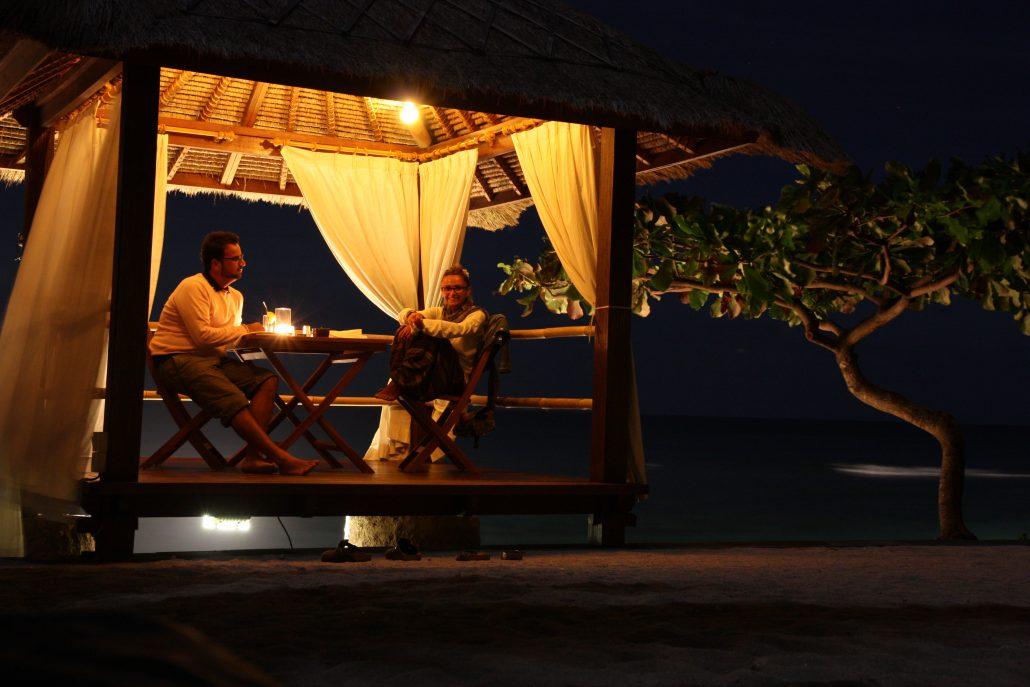 La Cabana, capanno con un solo tavolo per le cenette romantiche in riva al mare, è un luogo perfetto per meravigliarsi davanti al tramonto che illumina il vulcano Agung di Bali.